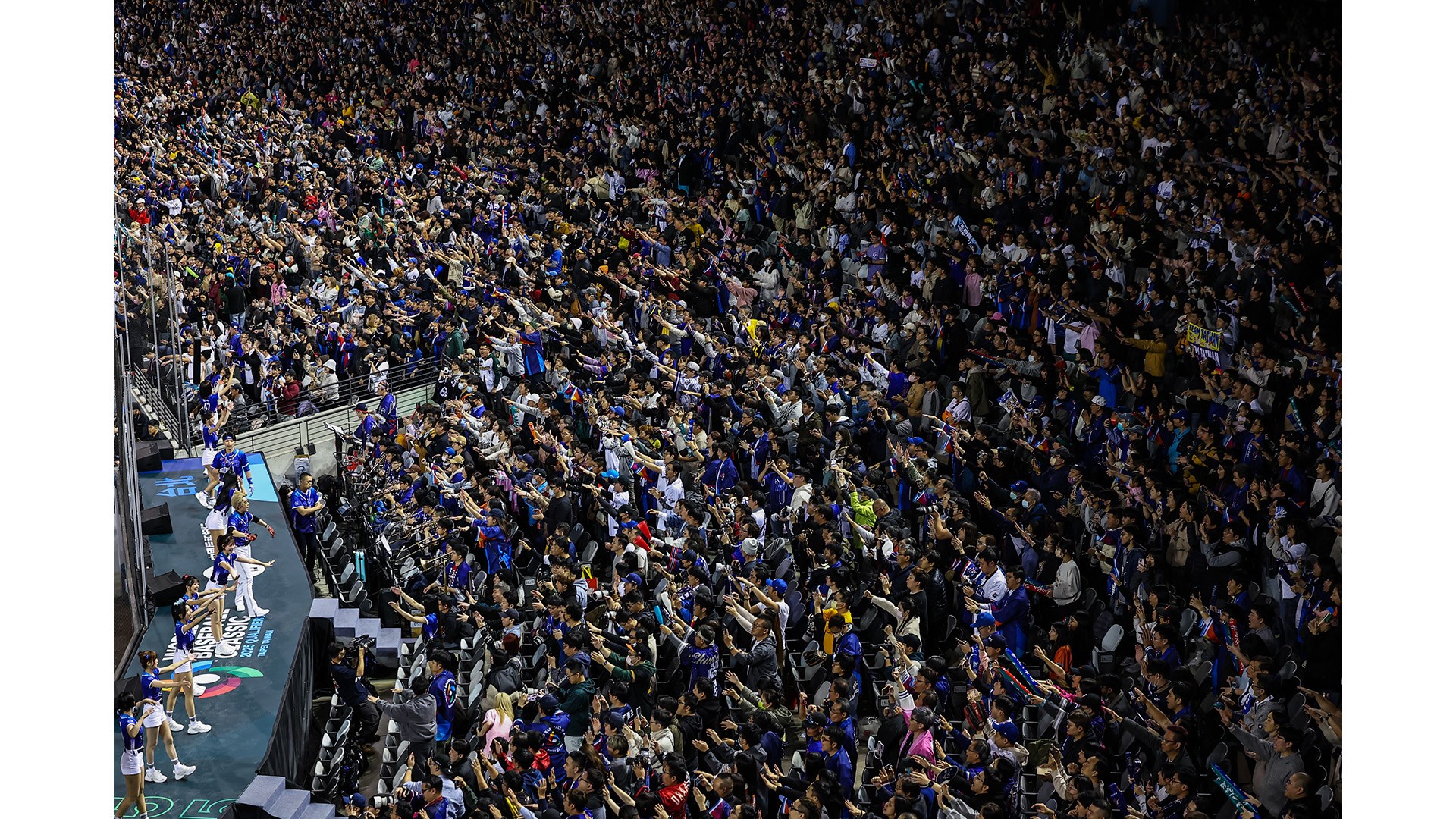 正當我在想構圖時,台灣隊擊出適時的一棒,觀眾席集體站了起來,連同冷靜的區域及啦啦隊都往球的方向看去,確認擊出安打後,全場又熱情的歡呼,啦啦隊亦又帶動觀眾為選手加油喝采……