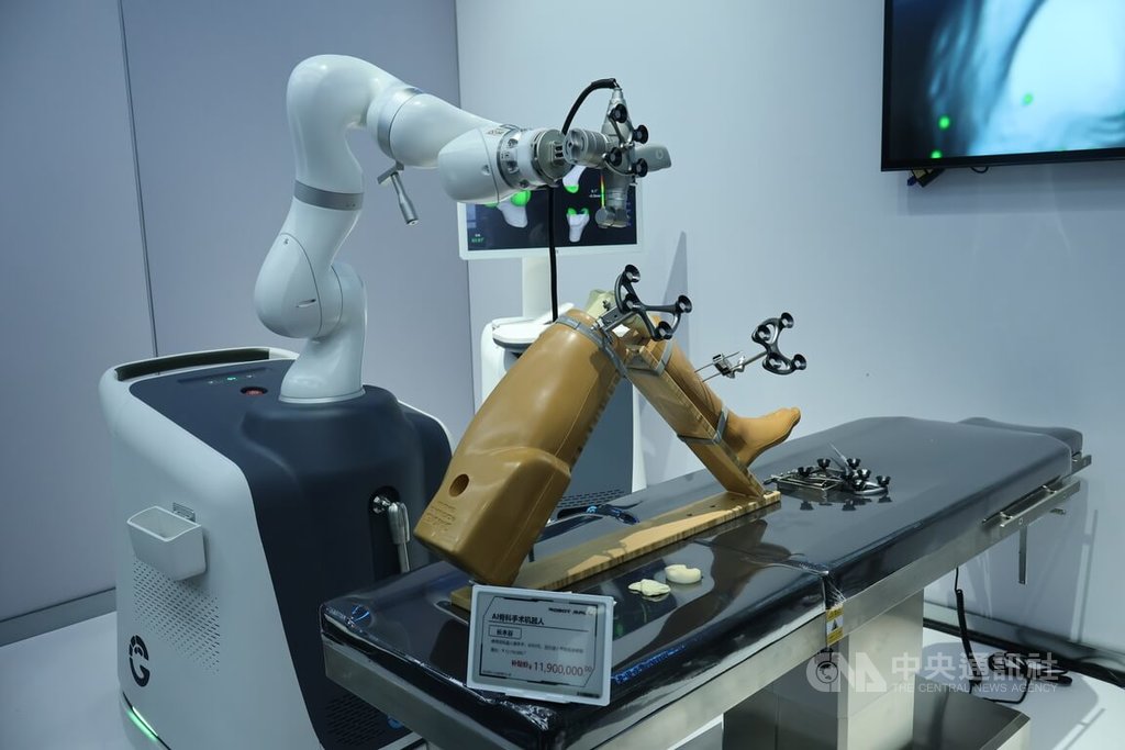 在康養應用展區,展示協助腿部受傷患者進行康復訓練的機器人、藥房分揀機器人、植牙手術機器人以及AI骨科手術機器人等。