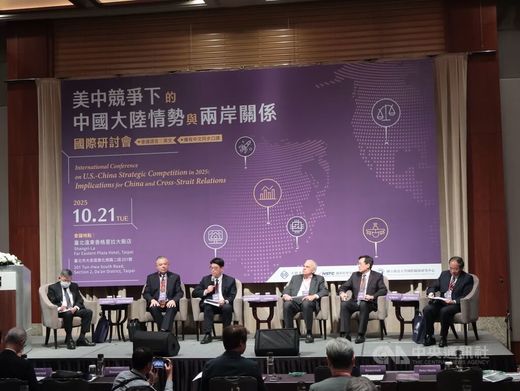 「美中競爭下的中國大陸情勢與兩岸關係」國際研討會21日在遠東香格里拉飯店召開,邱垂正下午主持圓桌論壇,論壇主題為美中台關係,他於論壇與談開始前以英文致詞。