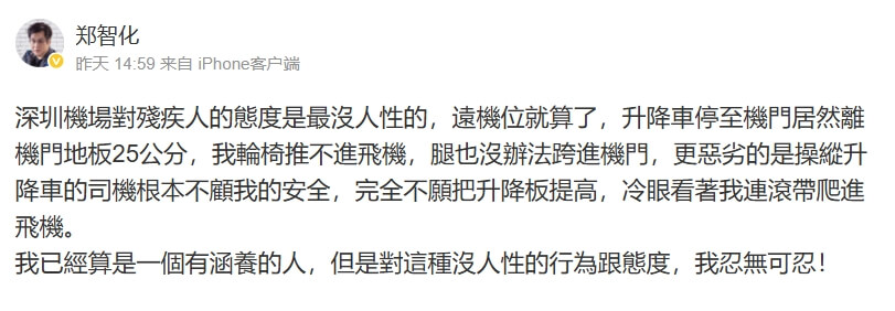 鄭智化25日在社群平台微博發文表示,他在深圳機場乘坐航班的時候,升降車升至機門後離機門地板有25公分距離,導致其輪椅無法推入飛機,腿也沒辦法跨進機門。而操縱升降車的司機不願把升降板提高,冷眼看著他「連滾帶爬」進飛機。此事在網路上引起關注和熱議。