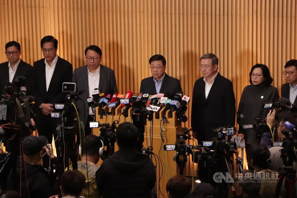 李家超晚上在政府總部率同多名主要官員召開記者會,交代後續援助受影響居民的工作。