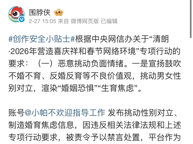 微博社區觀察員官方帳號「@圍脖俠」於27日發文指,帳號「@小帕不歡迎指導工作」發布挑動性別對立、製造婚育焦慮訊息,因違反相關法律法規和專項行動要求,被責令予以禁言處置,平台作為執行方執行禁言要求。