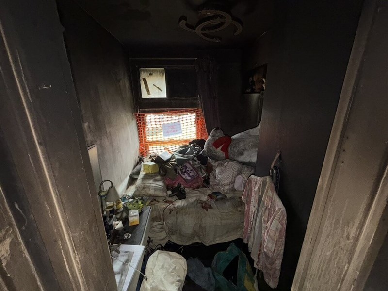 Dorz說,他步入大廈時看到大廳一片漆黑,接著沿著樓梯往上走,看到不少地方都被嚴重燒焦,樓梯間的窗戶全都碎了,「那時候眼淚就掉下來」。