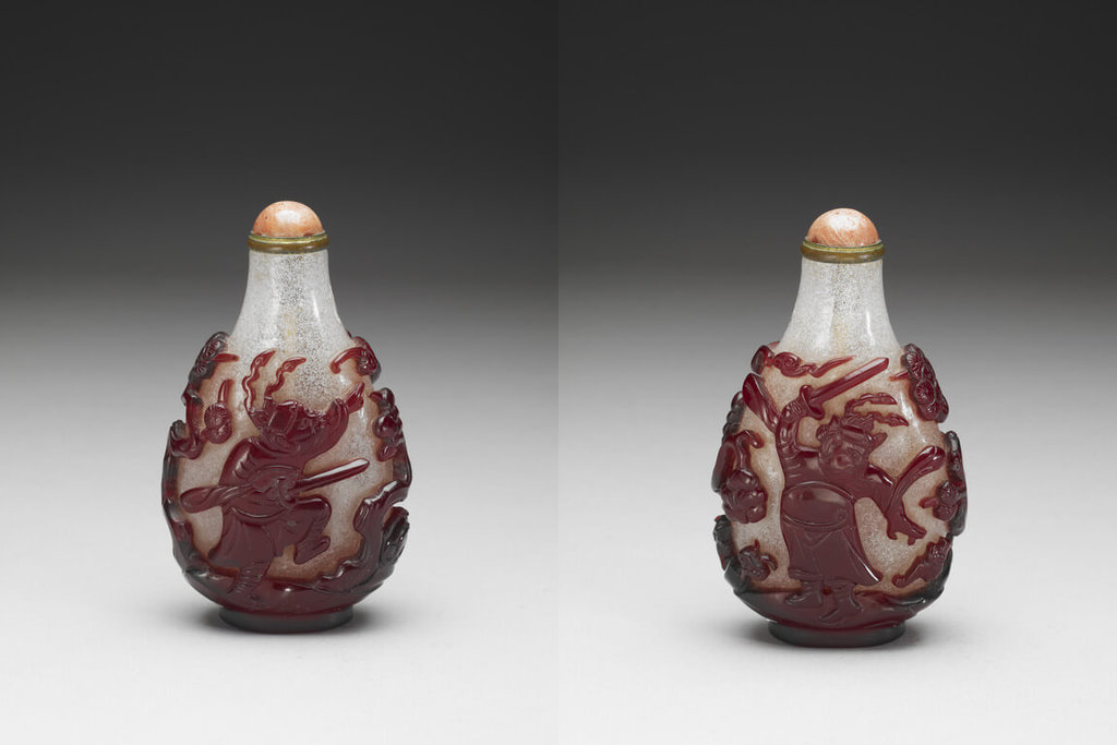 除文學故事的鬼魅,還有鎮邪護宅的神明形象,古人相信鬼可被驅除,因此在文人與畫家筆下,誕生能捉鬼、甚至將鬼吞入腹中的「鬼王」鍾馗。此次故宮捷克展將展出「清 霏雪地套紅玻璃鍾馗鼻煙壺」,器身套上紅色玻璃,雙面雕刻鍾馗形象,其中一面鍾馗奔走疾行;另一面鍾馗劍指蒼穹,俯視前方。