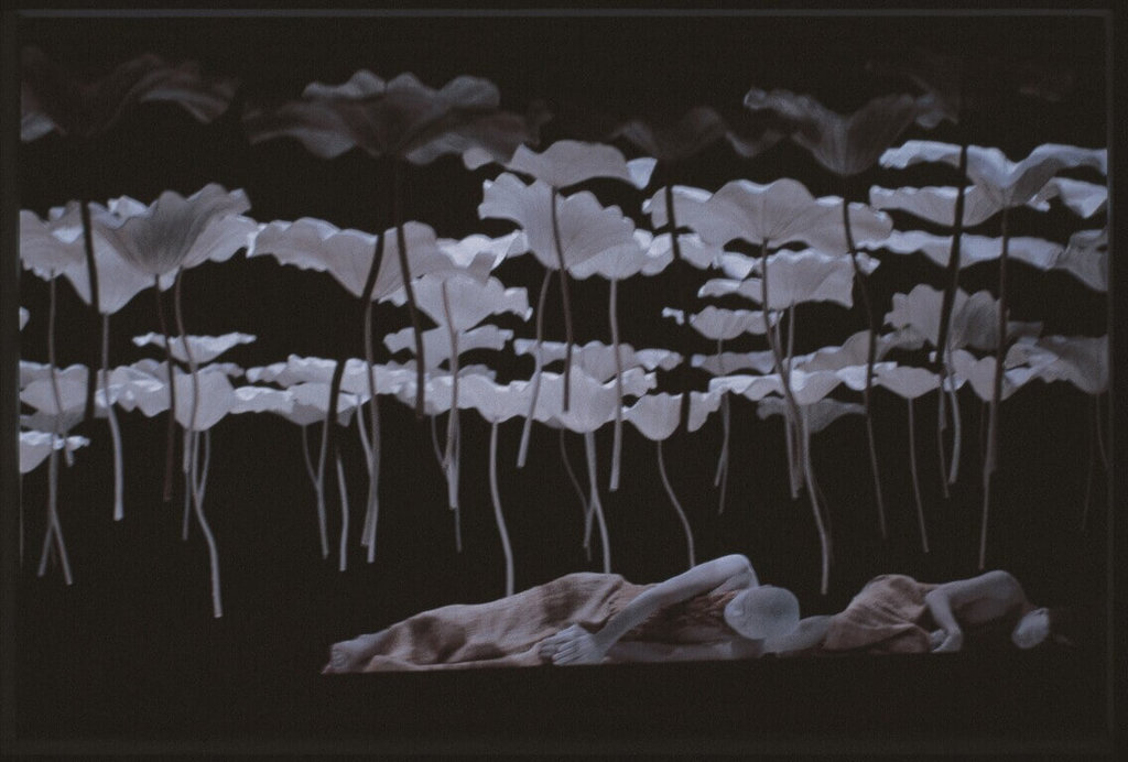 舞台上,光滑如鏡的地面倒映著舞者緩慢流動的身軀,朵朵蓮葉漂浮其間,隨著舞者的呼吸節奏緩緩騰空而上,營造出水面下神祕莫測的幻境空間。這些精心設計的視覺元素相互反射、彼此抗衡,既象徵著實體的鏡子,更隱喻著人類內在的本我映照。