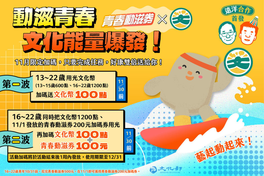 (中央社記者趙靜瑜台北31日電)文化部與運動部首度聯手推出「動滋青春X文化能量爆發」限時加碼,11月底前使用完1200點文化幣及200元加碼青春動滋券的青年,最高可再獲200點文化幣與100元青春動滋券回饋。