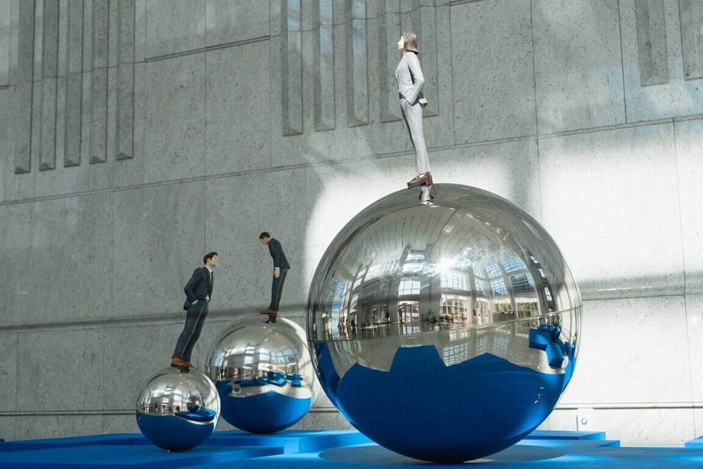 耿傑生長期發展的作品「合群系列」,每顆不鏽鋼球體動力裝置上都站著身著正裝的男女,球體以自主的晃動在場域中運行,讓觀者重新思考個體及群體的意義。