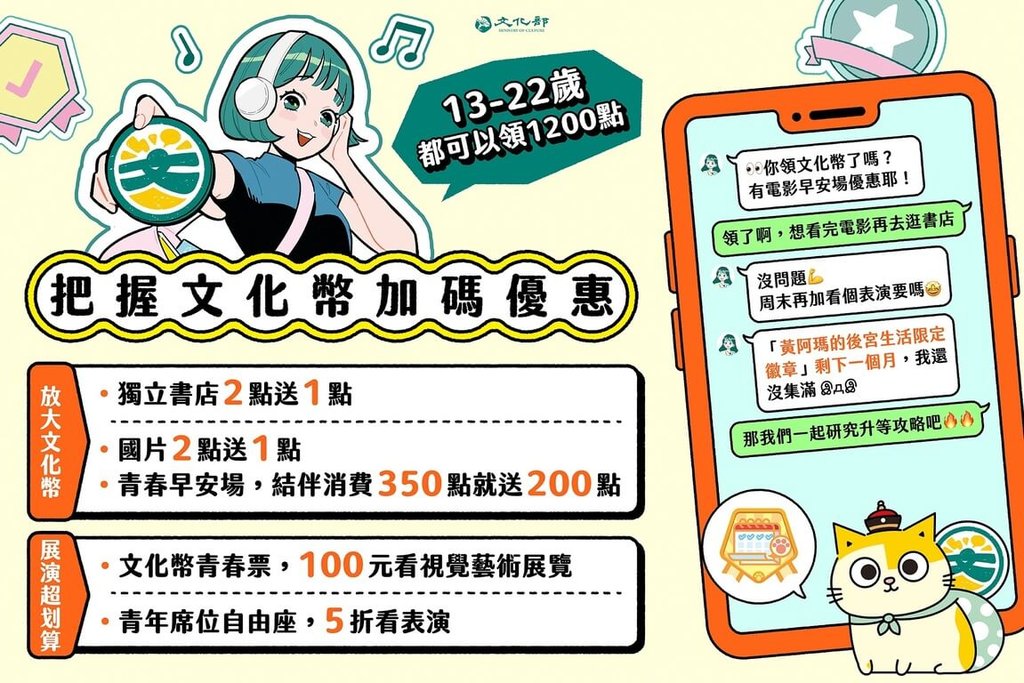 文化幣自2023年開始發放,今年邁入第4年,也常態化發放給13至22歲,共10年的青少年都能獲得1200點文化幣。文化部以獨立書店2點送1點、表演藝術青年席位、視覺藝術青春票、國片結伴同行優惠等,引導青少年接觸多元藝文體驗。