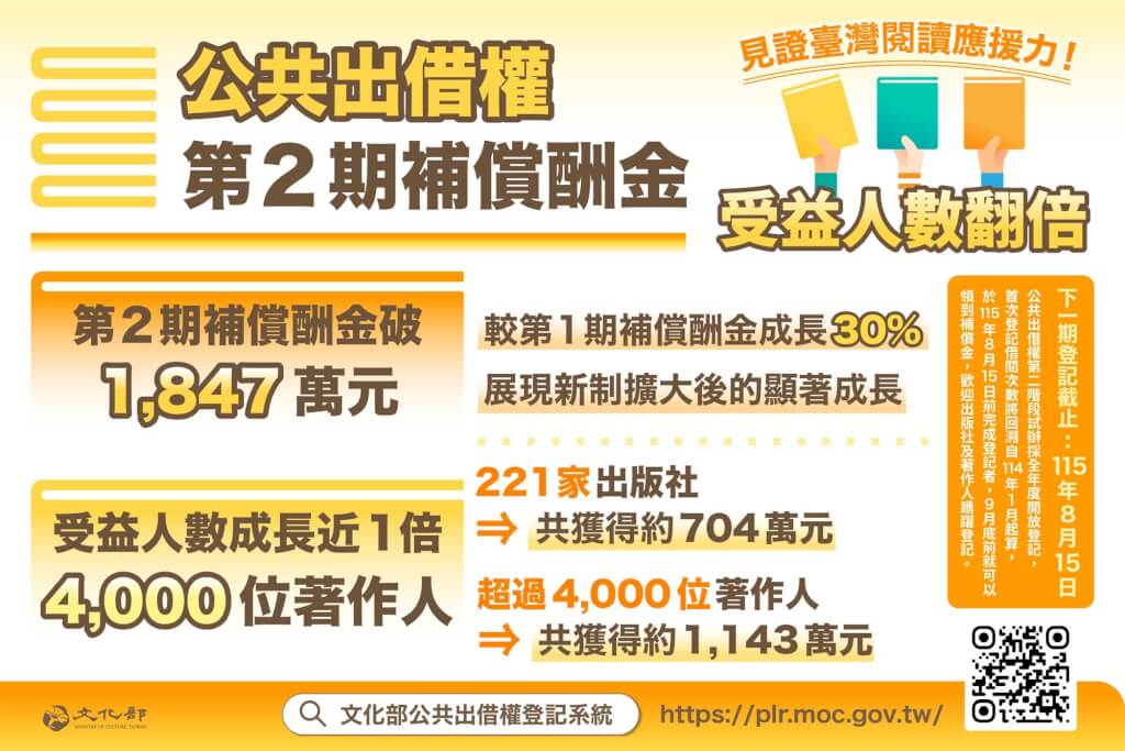 (中央社記者趙靜瑜台北13日電)文化部推動公共出借權,第2期(114年9-12月)補償酬金發放達1847萬元,超過4000名著作人及221家出版社受惠;相較第1期發放1410萬元,發放數增加30%,受益人數成長1倍。