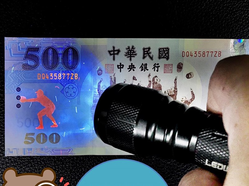 央行臉書粉絲團「鈔券小學堂」單元今天再次開講,告訴民眾關於鈔券的有趣小知識,只要在光線陰暗處,使用紫外線光源照射鈔券,就可以看到鈔券上的隱藏螢光圖案,這些隱藏版圖案也有防偽功能。