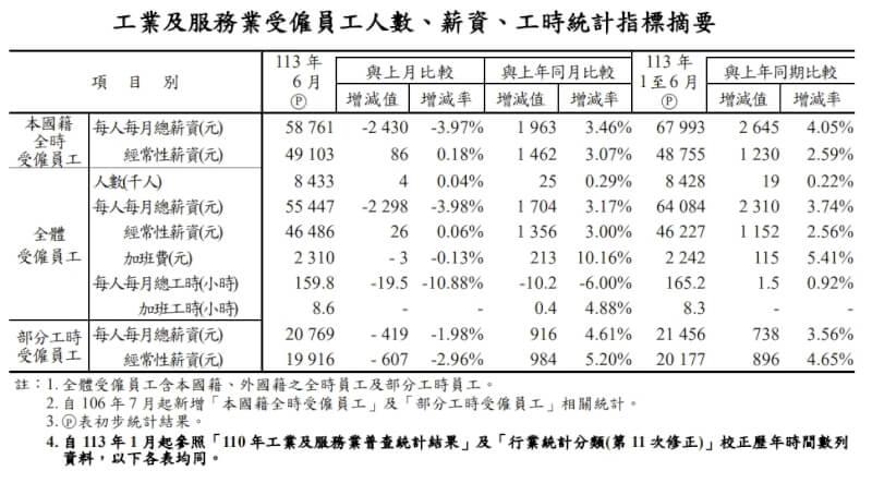 主計總處統計,今年上半年工業及服務業全體受僱員工經常性薪資為新台幣4萬6227元、年增2.56%,總薪資6萬4084元、年增3.74%;剔除物價因素後,實質經常性薪資及實質總薪資分別年增0.28%及1.43%。