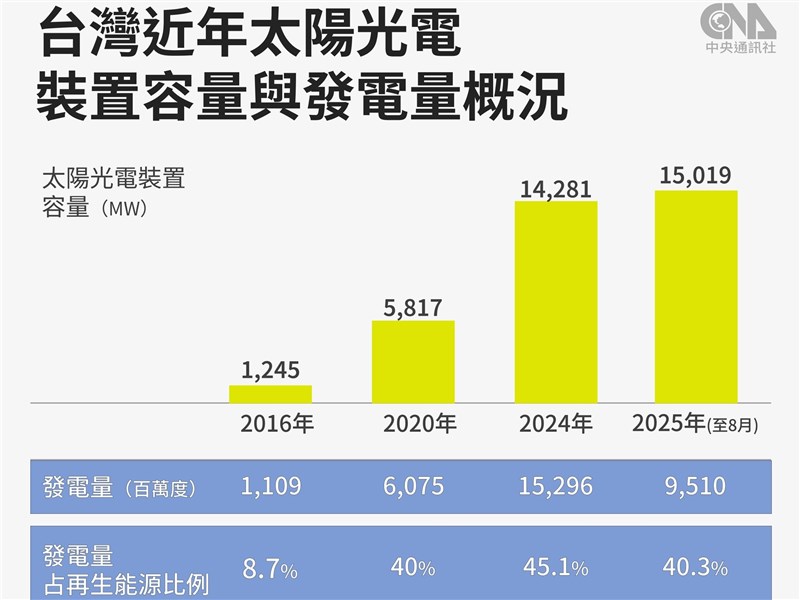 盤點10年來光電設置量有顯著成長,截至2025年8月,累計裝置容量達15.01GW,較2016年(1.245GW)成長11倍,政府也喊出2026年光電裝置容量目標20GW、2030年31.2GW。