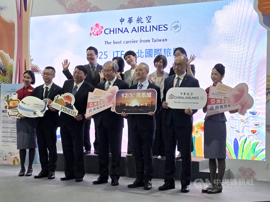 ITF台北國際旅展今天起登場,中華航空董事長高星潢、資深副總經理張程皓及台灣地區處長馮震宇出席,「AI品牌形象大使」也現身展區。