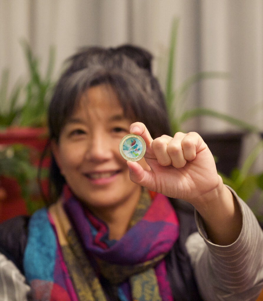 她說:「去年夏天我就設計好了硬幣,但鑄幣廠讓我保密,一年多後大家知道是我的作品後,許多認識與不認識的人紛紛要買這款紀念幣,還希望我在外盒上簽名,實在令我受寵若驚。」
