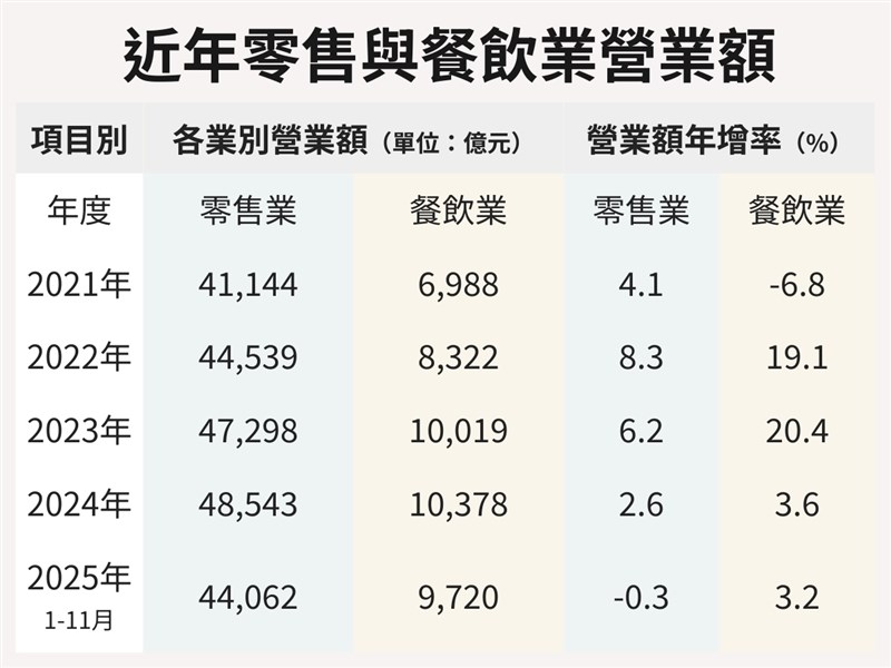 進一步觀察全年走勢,陳玉芳指出,今年第1季零售業年增率為0.9%,第2季及第3季則分別年減1.6%,連續2季負成長,顯示整體消費動能仍顯疲弱。不過,隨著下半年內需逐步改善,依統計處最新預估,第4季零售業年增率可望回升至1.2%至2.2%。