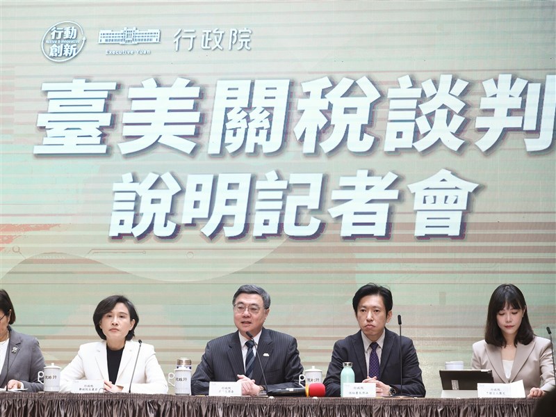 行政院20日舉行「台美關稅談判說明記者會」,院長卓榮泰(中)、副院長鄭麗君(左2)、祕書長張惇涵(右2)、政務委員楊珍妮(左1)及發言人李慧芝(右1)出席說明談判過程心路歷程。中央社記者王騰毅攝 115年1月20日