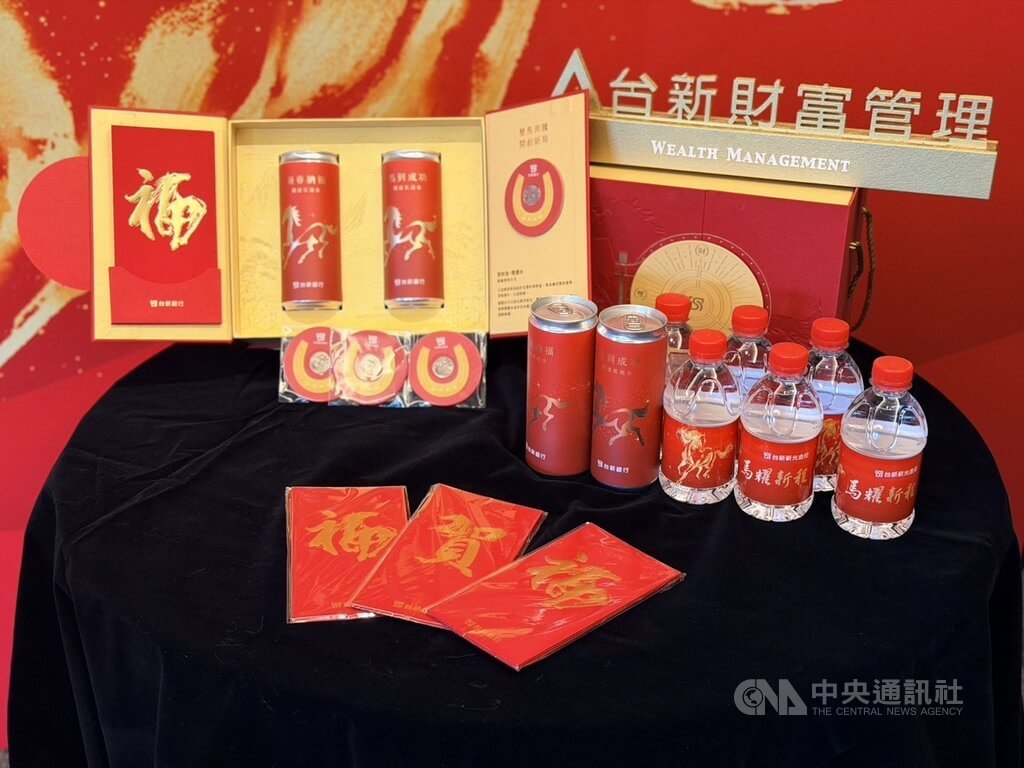 台新銀今年推出「金庫納財禮盒」,內含馬年紅包袋、發財金,以及2罐特別設計的開運氣泡水,並於全台分行準備5萬8888份經金山財神廟祈福的開運發財金,8萬8888瓶吸附金庫財氣的開運水,以及YBO兒童會員專屬的5888個馬年主題提燈,致贈臨櫃辦理業務的客戶。