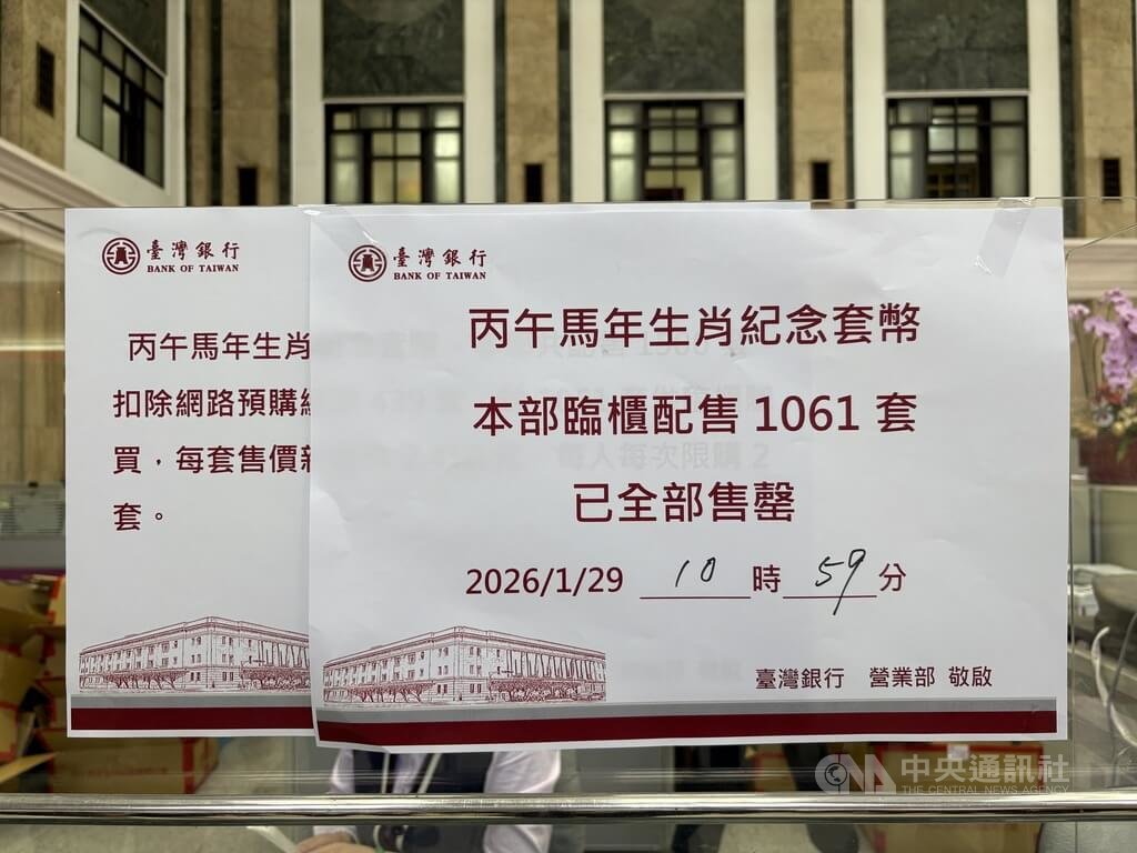 即便馬年套幣售價創紀錄,仍無法抵擋民眾熱情,台灣銀行總行今天上午9時開賣,不到2個小時就全數售罄,門口張貼公告「本部臨櫃配售1061套已全部售罄」。