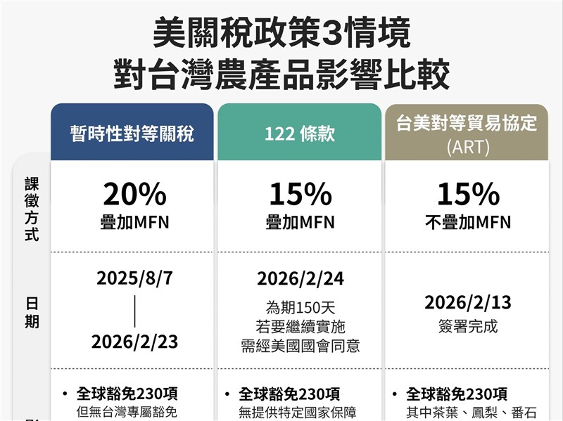 楊珍妮說,到今年還沒有公布ART時是20%去疊加,現在因為美國122條款(1974年貿易法第122條款)是10%疊加,其實比2月20日之前,它的稅率是比較低的,所以有些輸美的產品,它的MFN稅率是低的話,其實受到的待遇,跟其他國家是一樣的。(編輯:楊凱翔)1150303