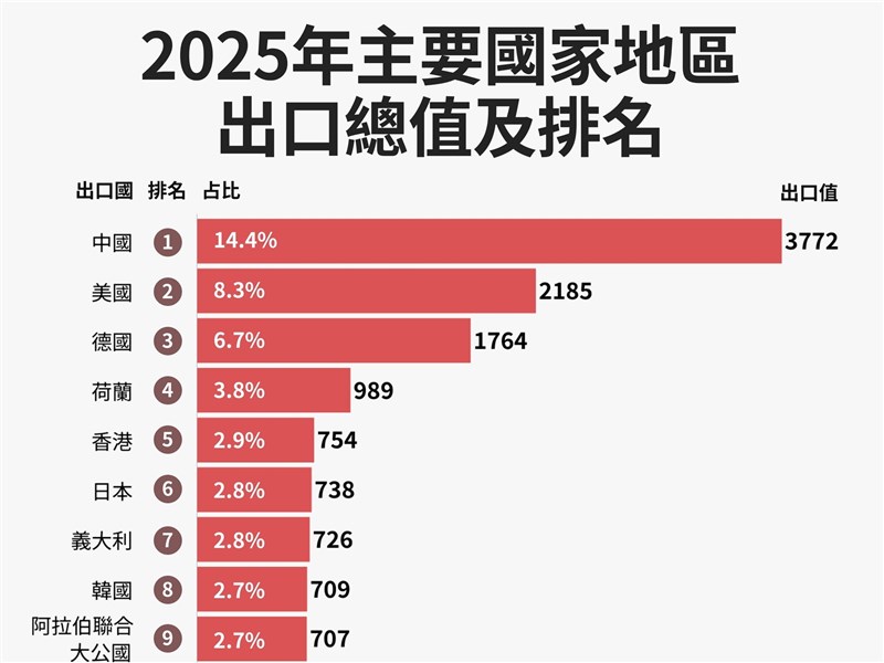 統計處指出,去年全球經濟隨AI應用快速擴展,帶動相關需求強勁,各國貿易動能普遍升溫。根據世界貿易組織(WTO)最新公布統計,2025年全球出口總值26.3兆美元,較2024年增加7.2%,以中國出口占比14.4%居首,其次依序為美國占8.3%、德國6.7%、荷蘭3.8%,而香港前進3名以2.9%排名第5,日本滑落1名以2.8%排名第6,南韓滑落2名以2.7%排名第8。