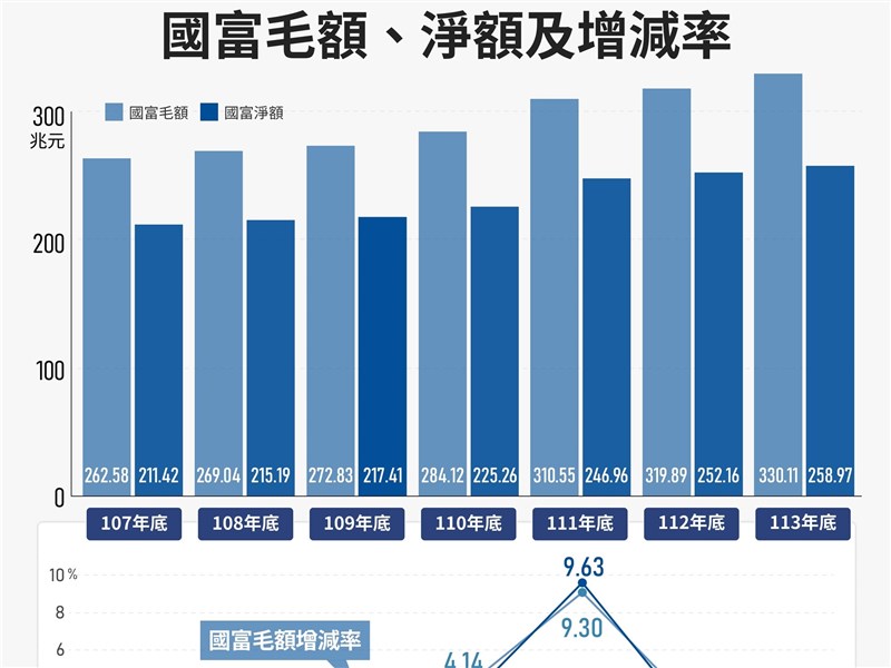 主計總處統計,113年底國富毛額為330.11兆元,較112年底增加10.23兆元或3.20%。