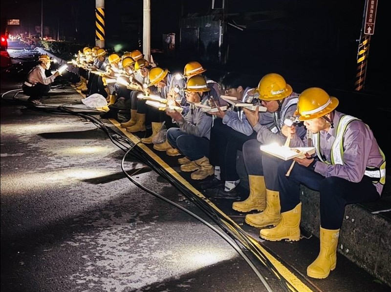 (中央社網站)颱風丹娜絲重創嘉義台南地區,全台一度有逾80萬戶停電。台電7日晚間在社群媒體分享照片,維修人員夜晚靠著安全帽燈光在路邊簡單用餐。台電表示,此次受災範圍廣數十年未見,盼受影響民眾理解。