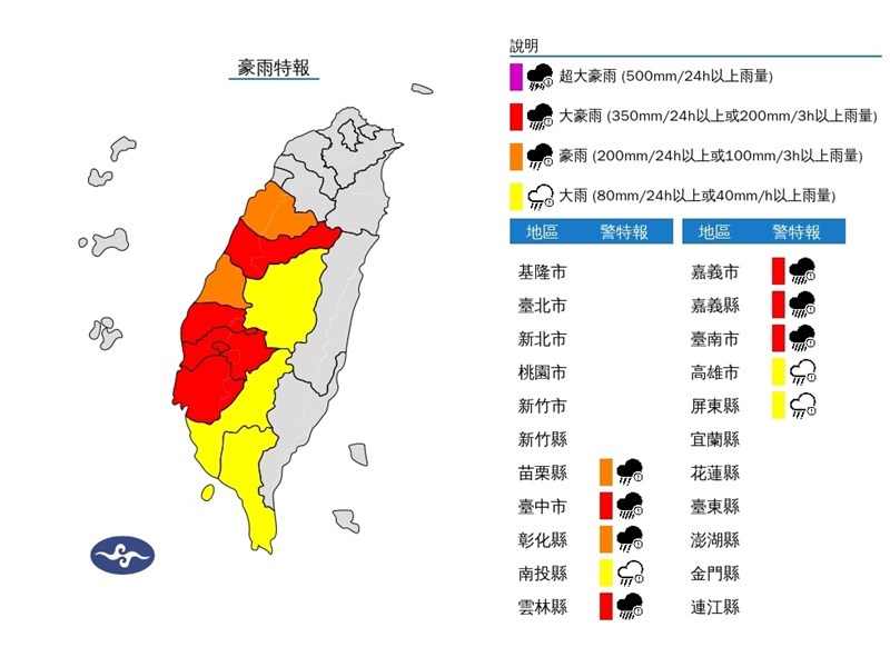 (中央社台北28日電)中央氣象署發布豪雨特報,低壓帶及西南風影響,易有短延時強降雨,今天台南市、嘉義市、嘉義縣、雲林縣、台中市地區有局部豪雨或大豪雨。
