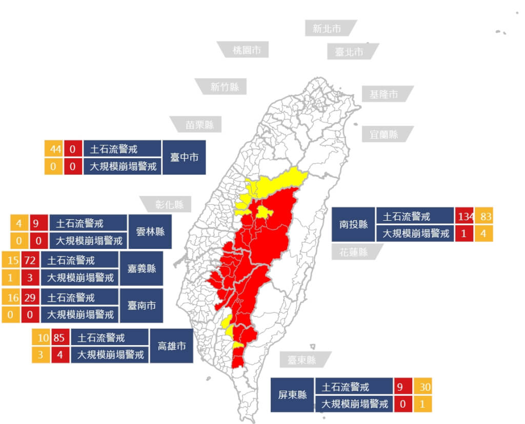 農村及水保署發布新聞稿,土石流紅色警戒潛勢溪流共338條,分布於南投縣、雲林縣、台南市、嘉義縣、高雄市、屏東縣,共6縣市29鄉115村;土石流黃色警戒潛勢溪流202條,分布於台中市、南投縣、雲林縣、台南市、嘉義縣、高雄市、屏東縣,共7縣市29鄉81村。