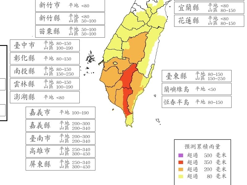 山區方面,預測未來24小時累積雨量高雄、屏東均為300至450毫米;嘉義縣、台南市200至340毫米;南投、台東150至250毫米:雲林縣100至190毫米。