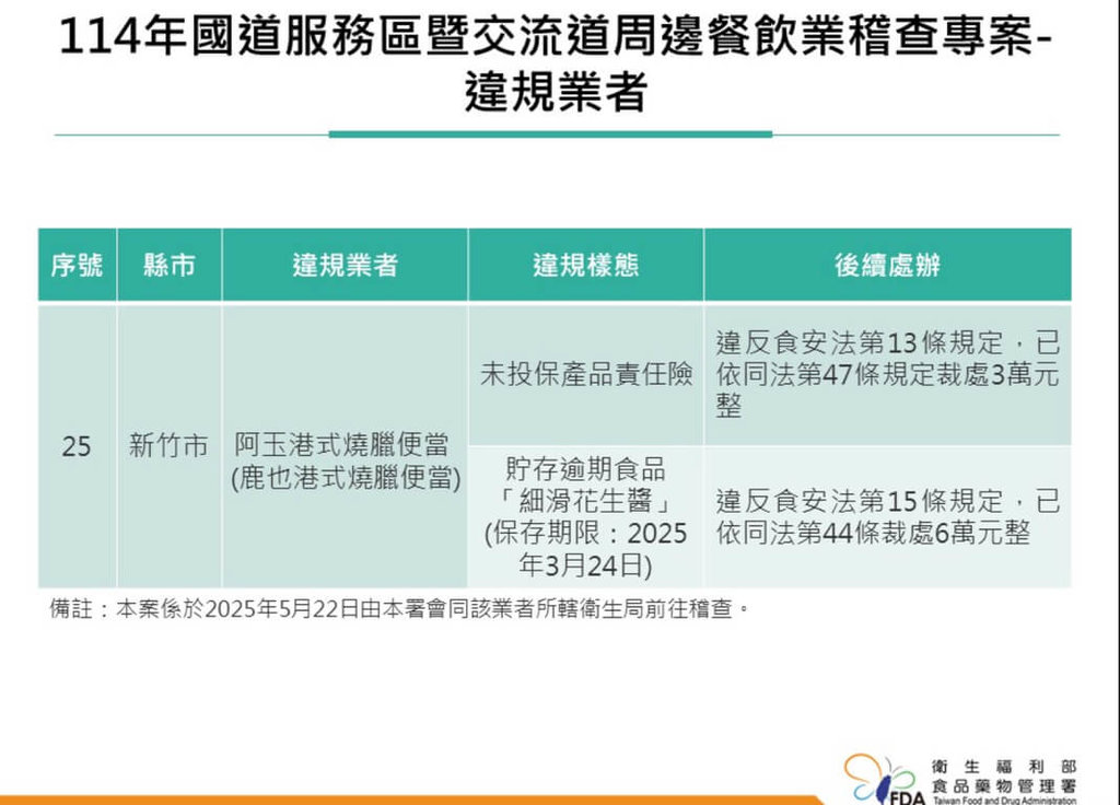 這次新竹系統交流道附近有1名業者,一口氣被查獲2項違規。林旭陽表示,首先是未投保產品責任險,違反食品安全衛生管理法第13條,遭裁處3萬元;貯存逾期食品「細滑花生醬」,期限為今年3月24日,稽查日期為5月22日,違反食安法第15條,遭裁處6萬元。