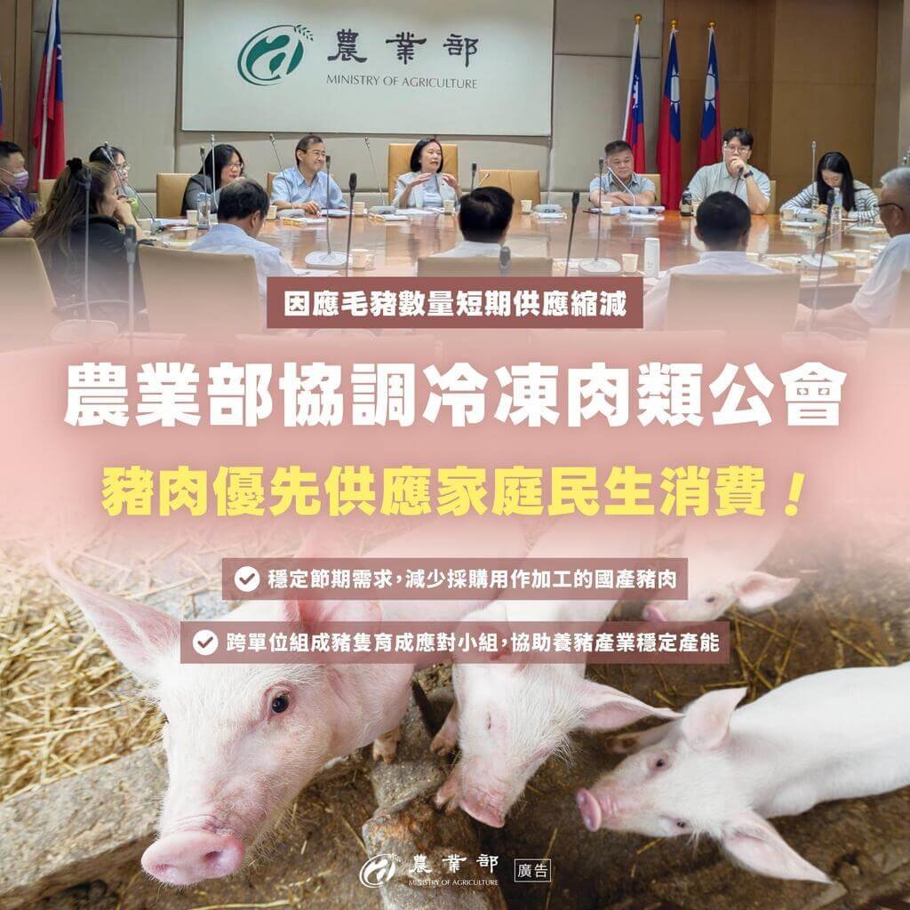 農業部發布新聞稿,近期因風災頻繁、夏季高溫及疫病干擾等多重因素,導致毛豬數量短期供應縮減,為提前因應中元節祭祀及中秋節採購需求,邀冷凍肉類商業同業公會開會,協調於節前減少採購用作加工的國產豬肉,以調整肉品市場採購比例,並將國產豬肉優先供應傳統市場及家庭消費使用。