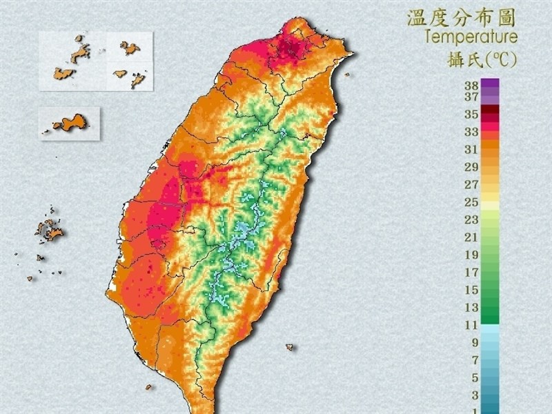 (中央社記者張雄風台北17日電)交通部中央氣象署今天持續發布高溫資訊,下午1時20分新北市五股區高溫達攝氏38度,台北、彰化也都出現37度以上。