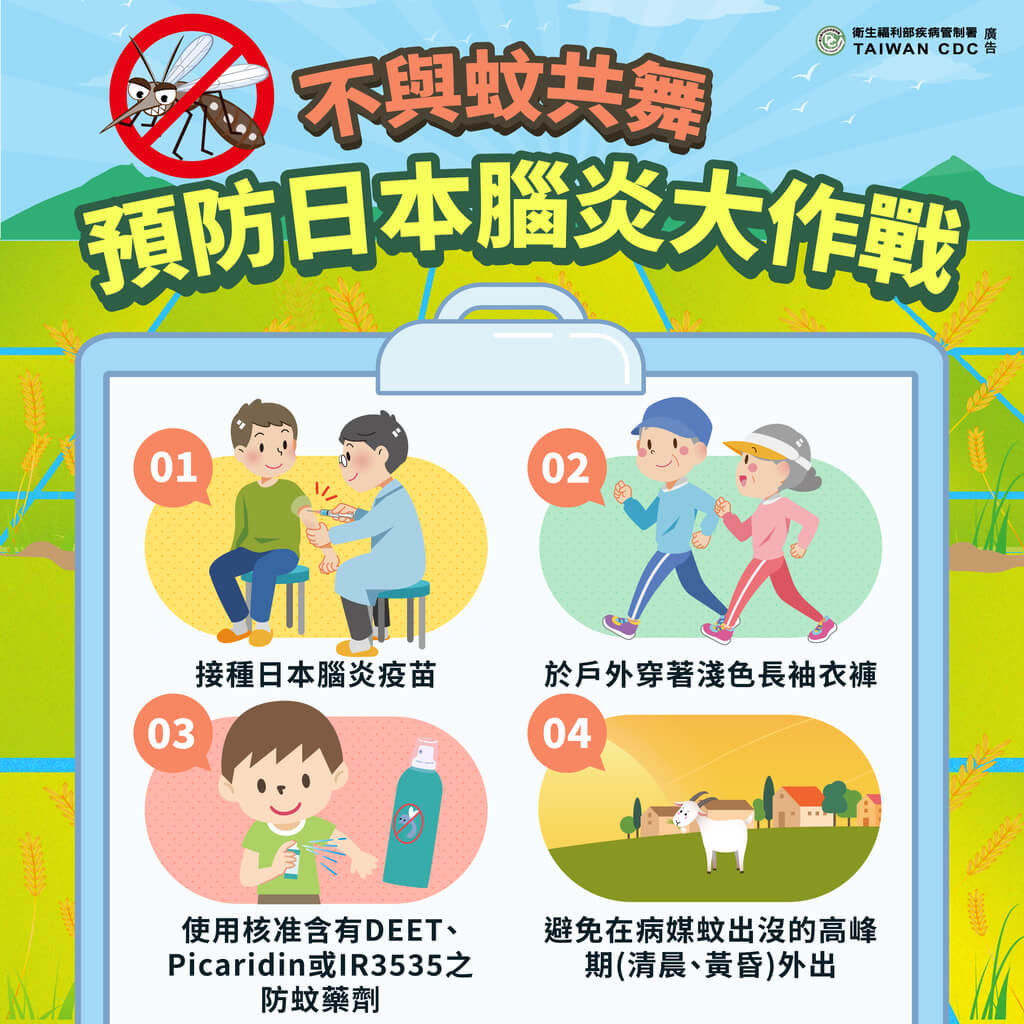 衛生局表示,日本腦炎病媒蚊吸血高峰為黃昏及黎明時段,且豬隻為病毒主要宿主,民眾應避免這段時間前往高風險環境及周邊活動。目前最有效預防方法為接種日本腦炎疫苗,幼兒接種時程為出生滿15個月接種第1劑,間隔12個月接種第2劑。