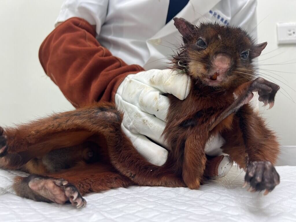 獸醫師謝弘斌指出,大赤鼯鼠頭部有擦傷,多日未進食極度饑餓,無法自行移動。動保員研判,大赤鼯鼠可能因饑餓白天外出覓食,但日前颱風引發外圍環流及豪雨影響視線,不慎自高處墜落,所幸傷勢不重;動保員說,大赤鼯鼠模樣呆萌討喜,安置後立即提供芭樂與蘋果,讓牠盡快補充體力重返山林。