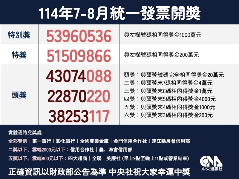 114年7、8月統一發票中獎號碼,特別獎(1000萬元)為53960536,特獎(200萬元)為51509866。