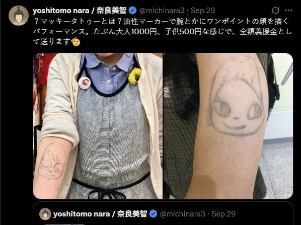 奈良美智日前在社群平台X發文宣布,4日及5日將在日本福島縣音樂節「風とロック芋煮会」,發起以麥克筆在手臂上作畫的「麥克筆刺青」募款活動,收費大約為成人1000日圓(約台幣208元)、小孩500日圓(約台幣104元),所有收入將全數捐給花蓮,並預計優先捐助較難獲得外界資源的地區。