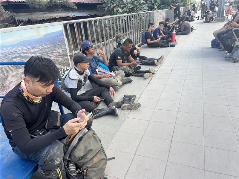 中秋連假首日,4日仍有許多熱心「鏟子超人」前往花蓮縣光復鄉協助災民恢復家園,午後等待返鄉車班時,不少人直接席地而坐,稍作休息。中央社記者盧太城攝 114年10月4日