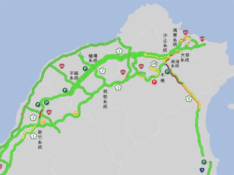 根據高公局即時路況顯示,截至下午12時52分,國3南向環東-南港呈現車速20公里以下紫色,車速僅3公里,至於國1北向高架汐止端-汐止系統與堤頂-汐止端、國1南向湖口服務區-竹北、國3北向木柵-南深路等路段車速均不到40公里。