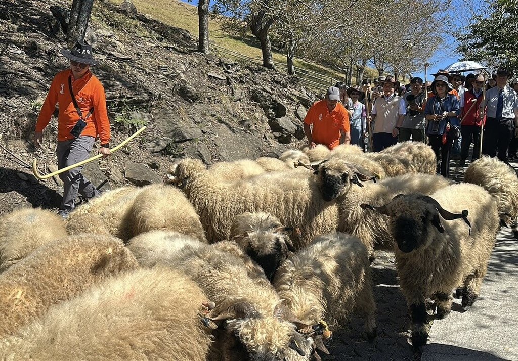 (中央社記者蕭博陽南投15日電)清境農場今天舉辦「雲嶺奔羊會」,30隻瓦萊黑鼻羊率領遊客漫遊觀山牧區,現場氣氛歡快。清境農場表示,首度舉辦「雲嶺奔羊會」,希望打造屬於清境地區的特色活動品牌。