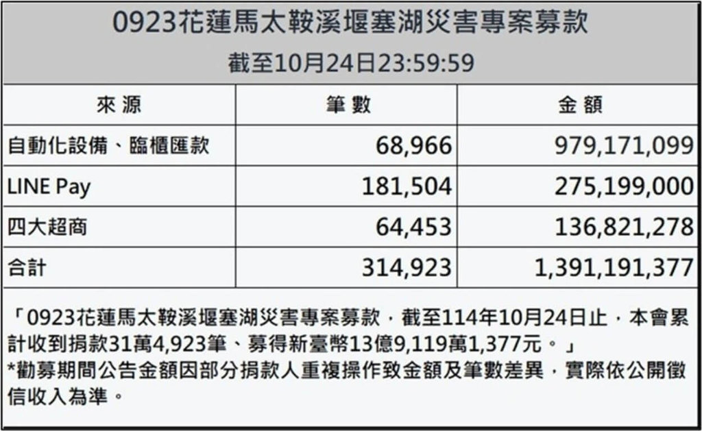 賑災基金會今天公布,累積至10月24日晚間11時59分,共募得31萬4923筆善款,總金額達13億9119萬1377元。