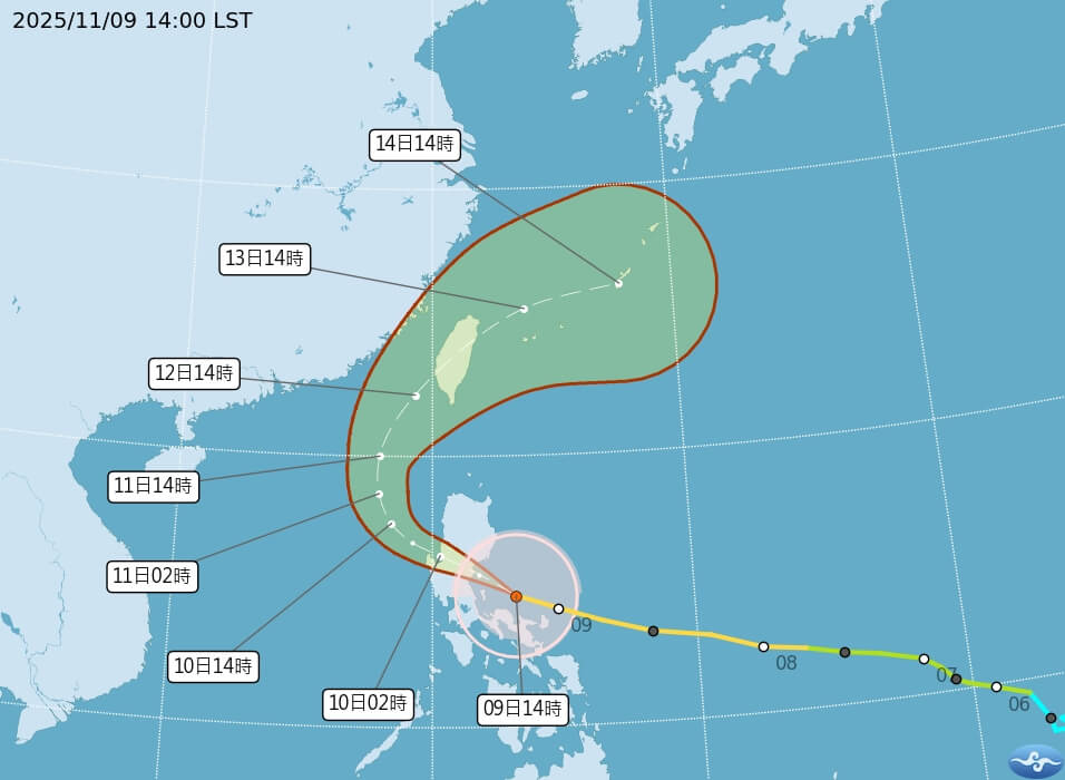 張承傳指出,12日台灣附近轉偏西南風至南風,花東地區、中南部注意大雨或豪雨,北部、東北部雨勢稍趨緩;13日颱風移至台灣東北方海面,各地雨勢再趨緩,環境偏東北風,中部以北、東北部有短暫陣雨,其他地區為局部短暫雨;14日、15日為東北季風影響,北部、東半部有局部短暫雨。