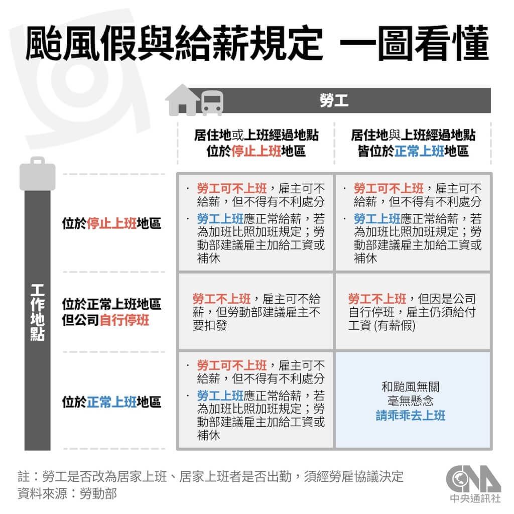 根據勞動部昨天新聞稿,依「天然災害發生事業單位勞工出勤管理及工資給付要點」,明訂天然災害發生時,為保障勞工生命安全,勞工應以不出勤為原則,如確需要勞工出勤,雇主應提供勞工通勤協助,如勞工依原定上、下班通勤方式(台鐵、捷運、公車等)有困難,而有搭乘計程車必要時,雇主應支付相關費用。