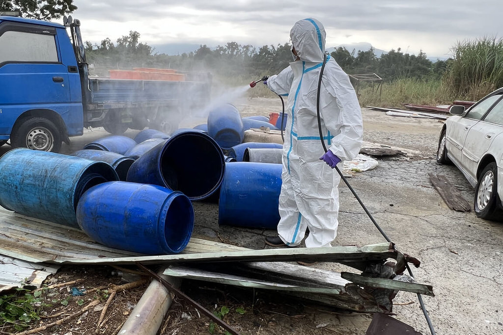 台南市政府農業局今天發布新聞稿指出,遭查獲養豬場共有168頭豬、10桶廚餘,飼料槽內留有明顯廚餘殘渣,情節明確違法,台南市動物防疫保護處當日立即採樣、啟動裁處程序,並採最高等級防疫措施,啟動全面環境清消,對豬場內外、載運車輛與空桶進行清潔消毒,阻斷任何可能風險。