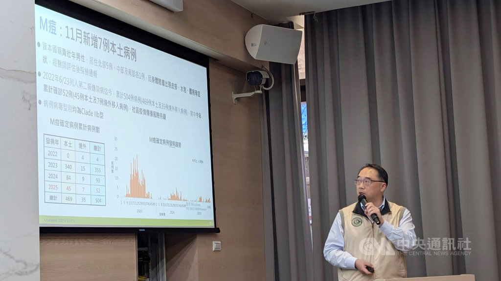公費流感疫苗打氣旺已用逾9成 疾管署增購15萬劑9月新聞》世衛組織宣布 M痘疫情不再構成國際公衛緊急事件台中男子腹股溝紅腫 就醫確診本土M痘- 近期週週有人確診M痘 11月增7例疫情風險持續2025/11/25 15:42