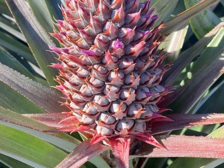 高雄農改場說明,鳳梨的果實屬於「多花果」,是由許多小果(果目)組成,每個果目都來自一朵小花,開花時,從花序底部開始一圈一圈往上順序開放,整個過程大約3週;由於底部的小果最早發育,當果實採收時,底部的果目成熟度最高,酸度較低、糖分較高,所以「鳳梨頭」是果實底部,並不是靠近頂端的冠芽。