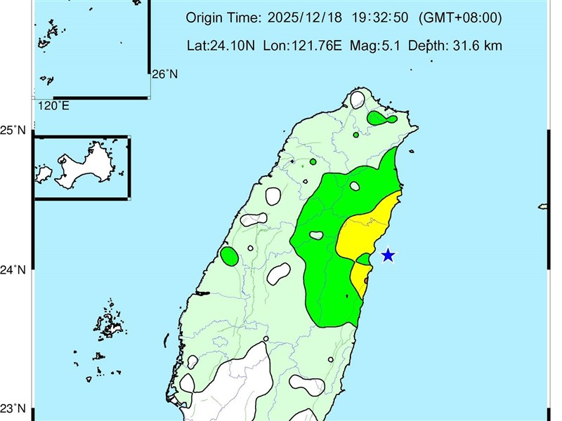 根據交通部中央氣象署最新資訊,今晚7時32分在花蓮縣政府東北方18.3公里,位於台灣東部海域,發生芮氏規模5.1地震,地震深度31.6公里,最大震度花蓮鹽寮4級。