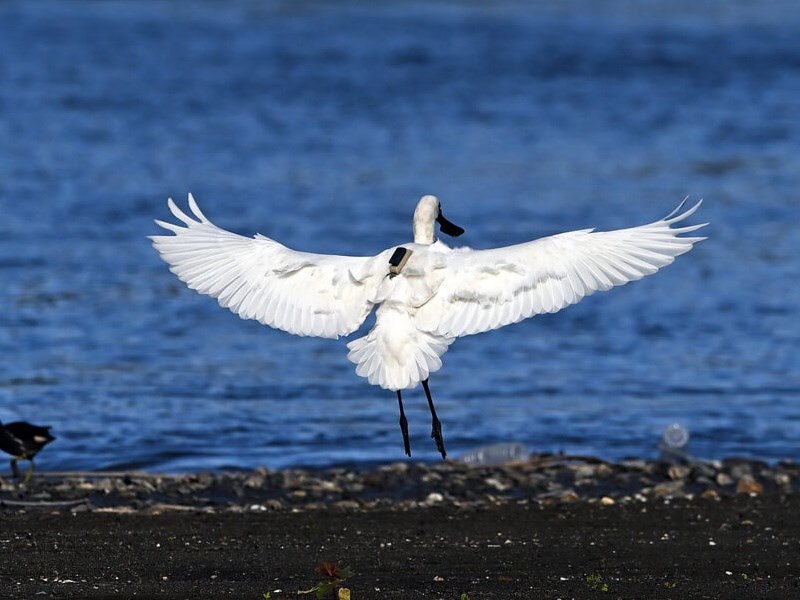有眼尖鳥友發現,這隻黑面琵鷺背有衛星定位發報器,右腳藍白色環、左腳紅色環編號「12E」。