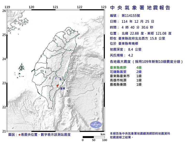 (中央社台北25日電)根據中央氣象署最新資訊,25日4時40分發生芮氏規模4.2地震,地震深度8.4公里,震央位於台東縣政府北北西方15.8公里(位於台東縣卑南鄉),最大震度台東縣4級。(編輯:陳正健)1141225