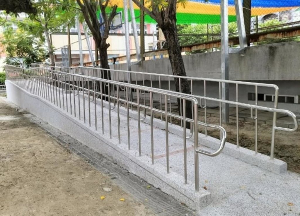 台南市佳里國小行政大樓有3座樓梯自民國93年使用至今,木製扶手老舊,不符合無障礙設施規定,校方更新為不鏽鋼扶手,並加裝止滑設置,讓師生使用更安全。