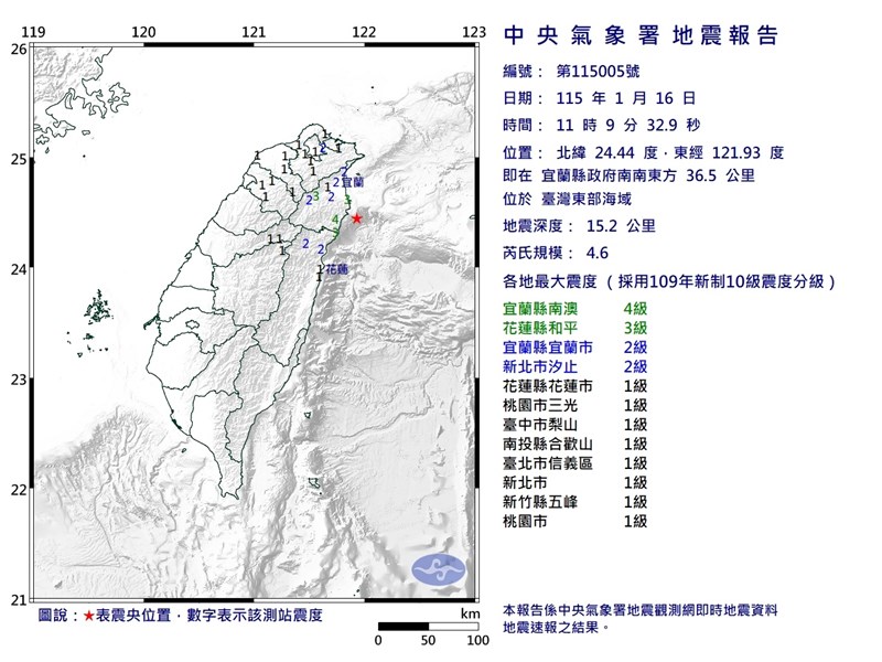 宜蘭外海地震規模4.6 最大震度南澳4級
